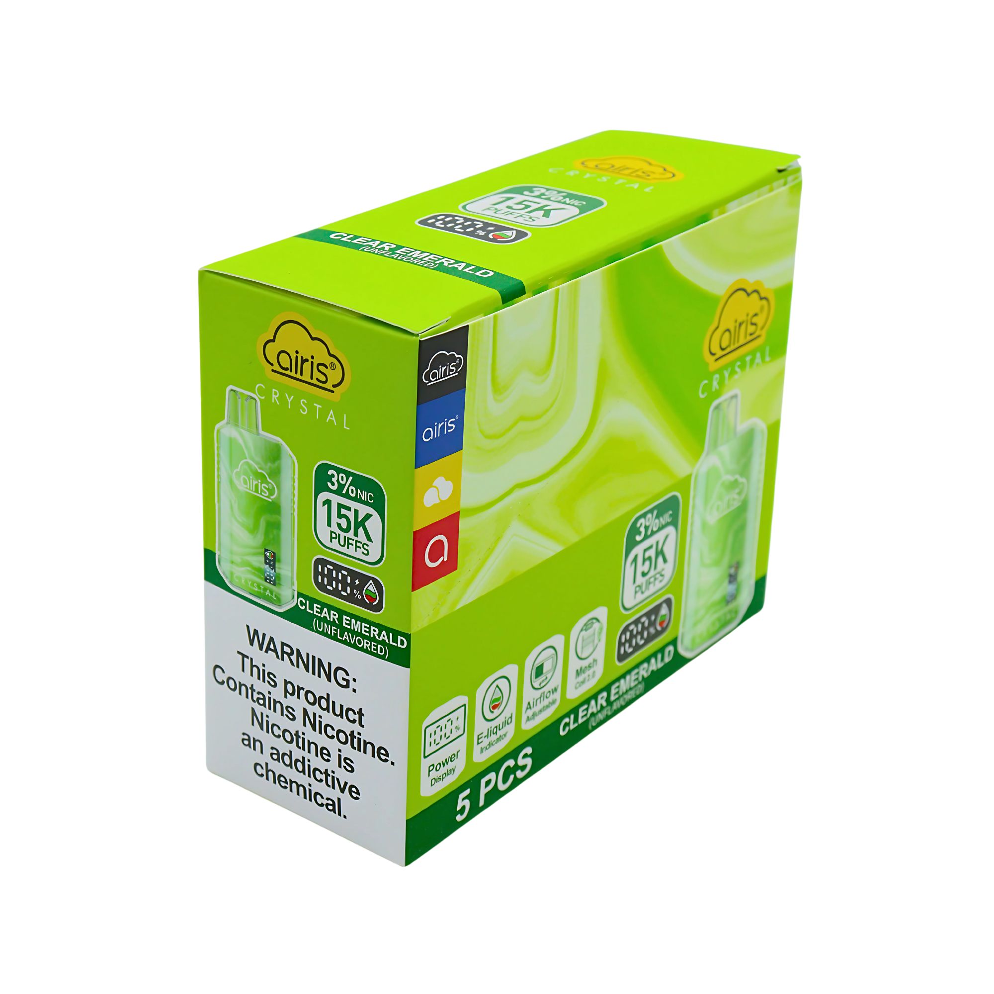 AIRIS CRYSTAL DISPOSABLE 15000PF CLEAR EMERALD (UNFLAVORED) 3% -BOX OF 5